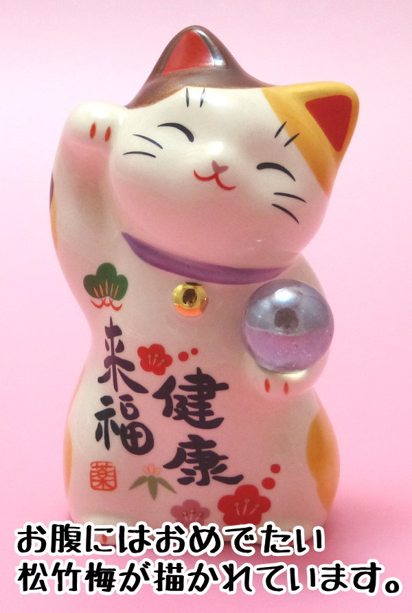 招き猫があなたに金運を招きます!! 右手で金運をあなたに招きます!! こちらの招き猫にはお腹に「健康来福」の文字と縁起物の「松竹梅」が描かれているので、小さくてもしっかりと福を招きます持っている玉は風水では浄化の力があり、風水パワーを高めると言われています。
