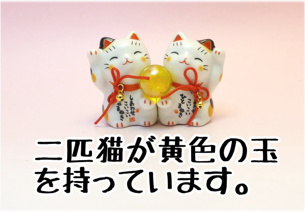 招き猫の特徴と飾り方 右手をあげた「金運招き猫」と左手をあげた「人招き招き猫」の2匹が黄色い玉を持っています。