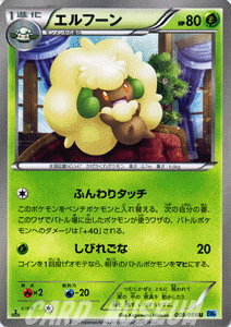 ■収録:BW6拡張パック「フリーズボルト」 ■カード名:エルフーン ■HP:80/タイプ:草 ■弱点:炎×2/抵抗:水-20/逃げる:1 ■種類:1進化ポケモン ■ワザ ●無:ふんわりタッチ このポケモンをベンチポケモンと入れ替える。